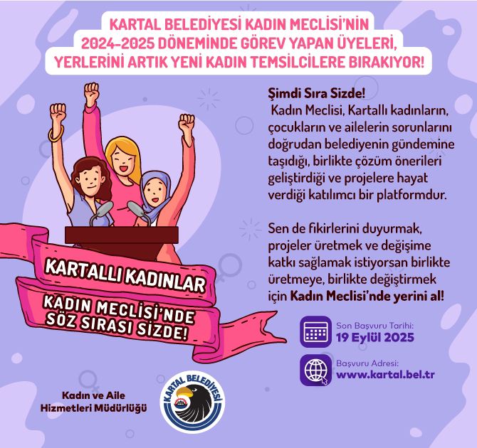 Kartal Belediyesi internet sitesi www.kartal.bel.tr üzerinden yapılacak olan başvurular ile Kadın Meclisi yeni üyeleri belirlenecek. Son başvuru tarihi ise 19 Eylül 2025.