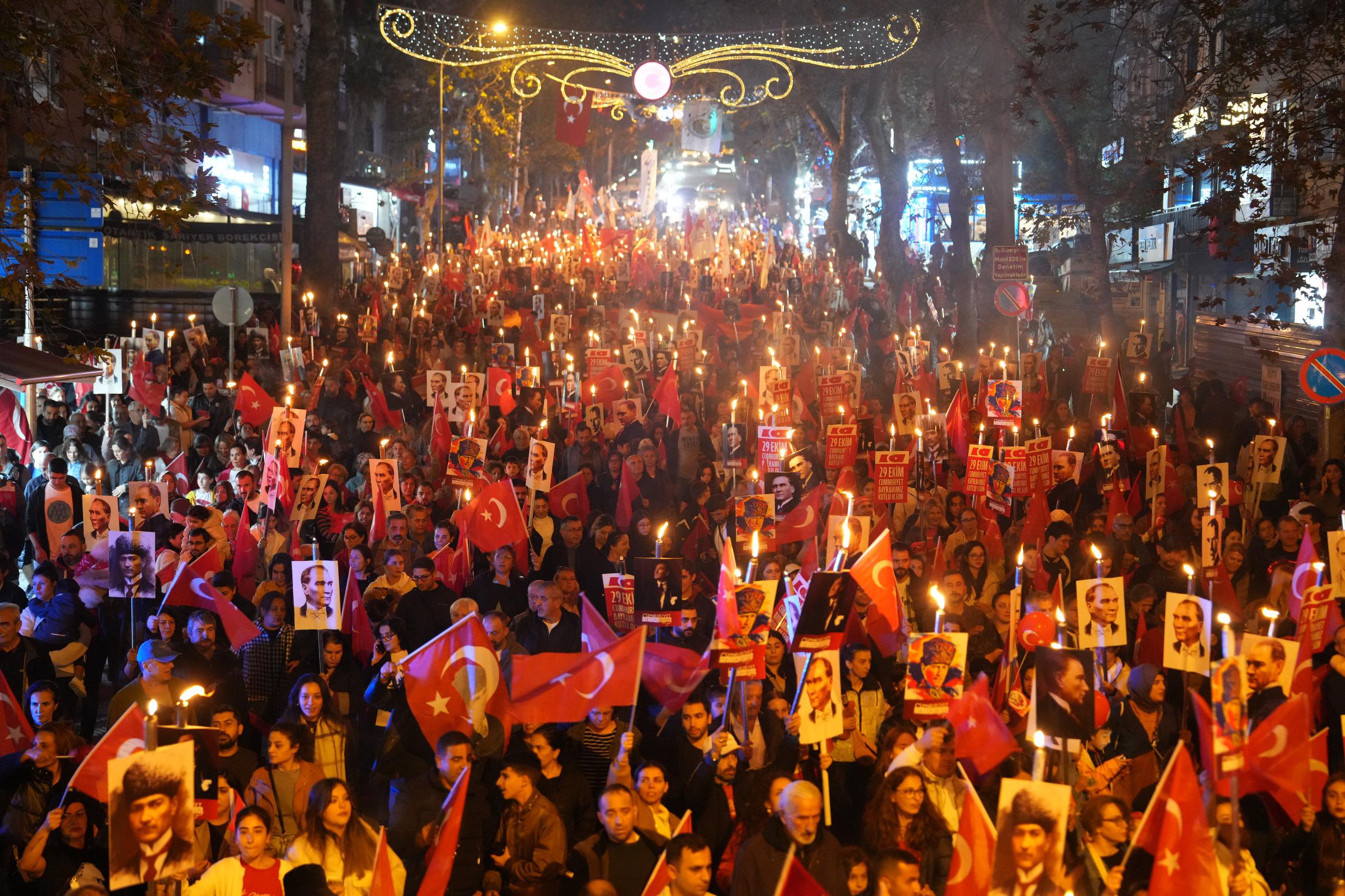 Akşam saatlerinde Kartal, Cumhuriyet coşkusuyla bir kez daha kenetlendi. Kartal Belediye Başkanı Gökhan Yüksel, CHP Kartal İlçe Başkanı Mert Polat, belediye başkan yardımcıları, meclis üyeleri, sivil toplum temsilcileri, mahalle muhtarları ve vatandaşlarında katıldığı fener alayı, Kartallı Kazım Meydanı’ndan Kartal Meydanı’na kadar marşlar eşliğinde gerçekleşti. Binlerce Kartallı, ellerinde Türk bayrakları, meşaleler ve Atatürk posterleriyle yürüyüşe katılarak meydanı doldurdu. Başkan Gökhan Yüksel ve eşi Sibel Doğan Yüksel, fener alayı yürüyüşü sırasında evlerinin balkonundan korteji selamlayan vatandaşların coşkusuna ortak oldu.