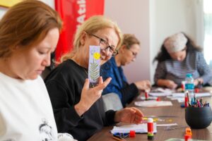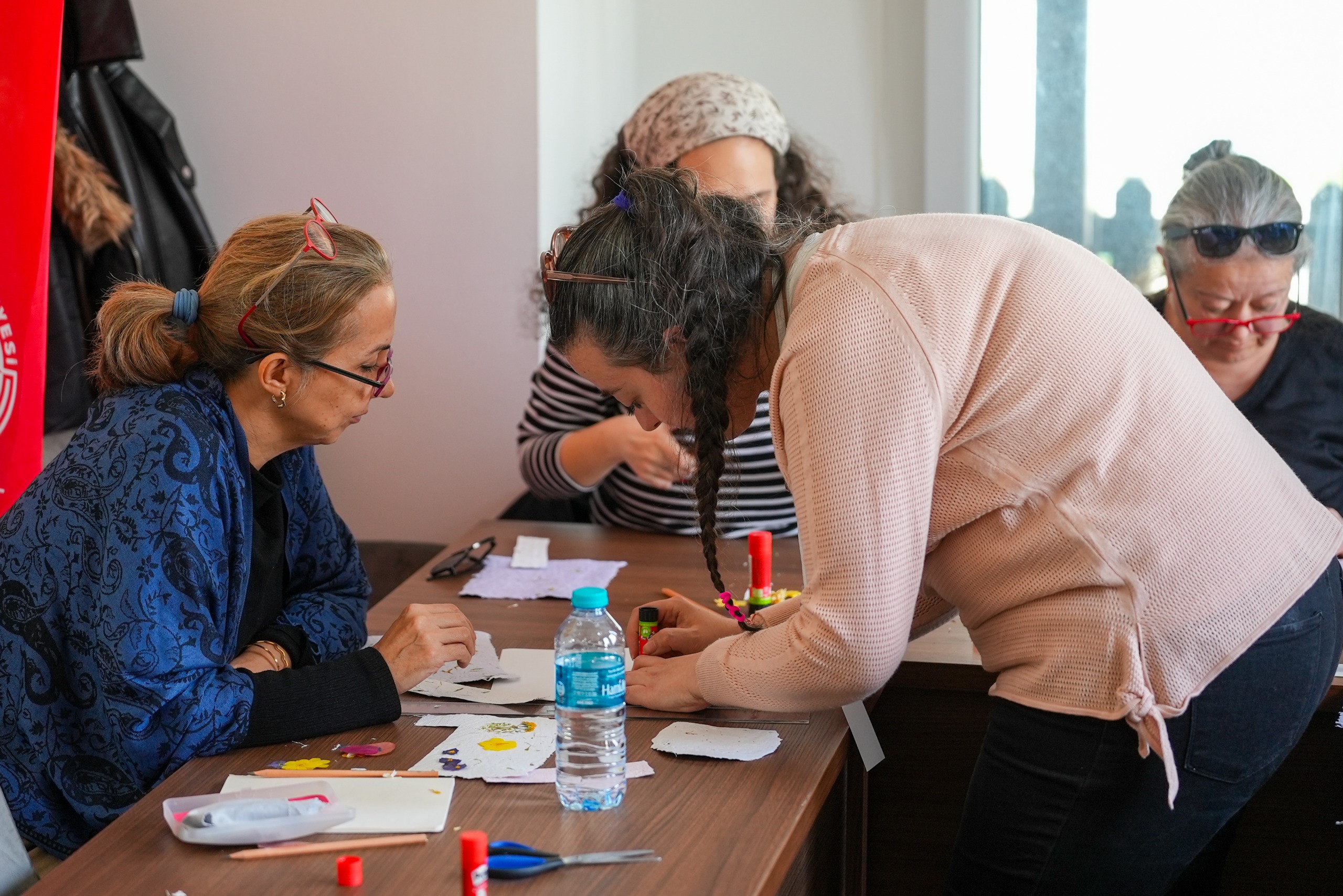 Atık kağıtların geri dönüştürülerek kullanılabilir hale getirilmesi için Feyzullah Mahalle Evi’nde düzenlenen atölyede katılımcılar, geleneksel yöntemle kâğıt üretimi atölyesinde ürettikleri geri dönüştürülmüş kâğıtları, kurutulmuş çiçekleri kullanarak kitap ayraçlarına dönüştürdüler. Çalışmada kitap ayraçlarının temel maddesi olarak tohumlu kâğıt kullanıldığı için bu ürünlerin formu bozulmaya başlayınca toprağa gömülerek çiçekler yetişmesine olanak sağlanacak.