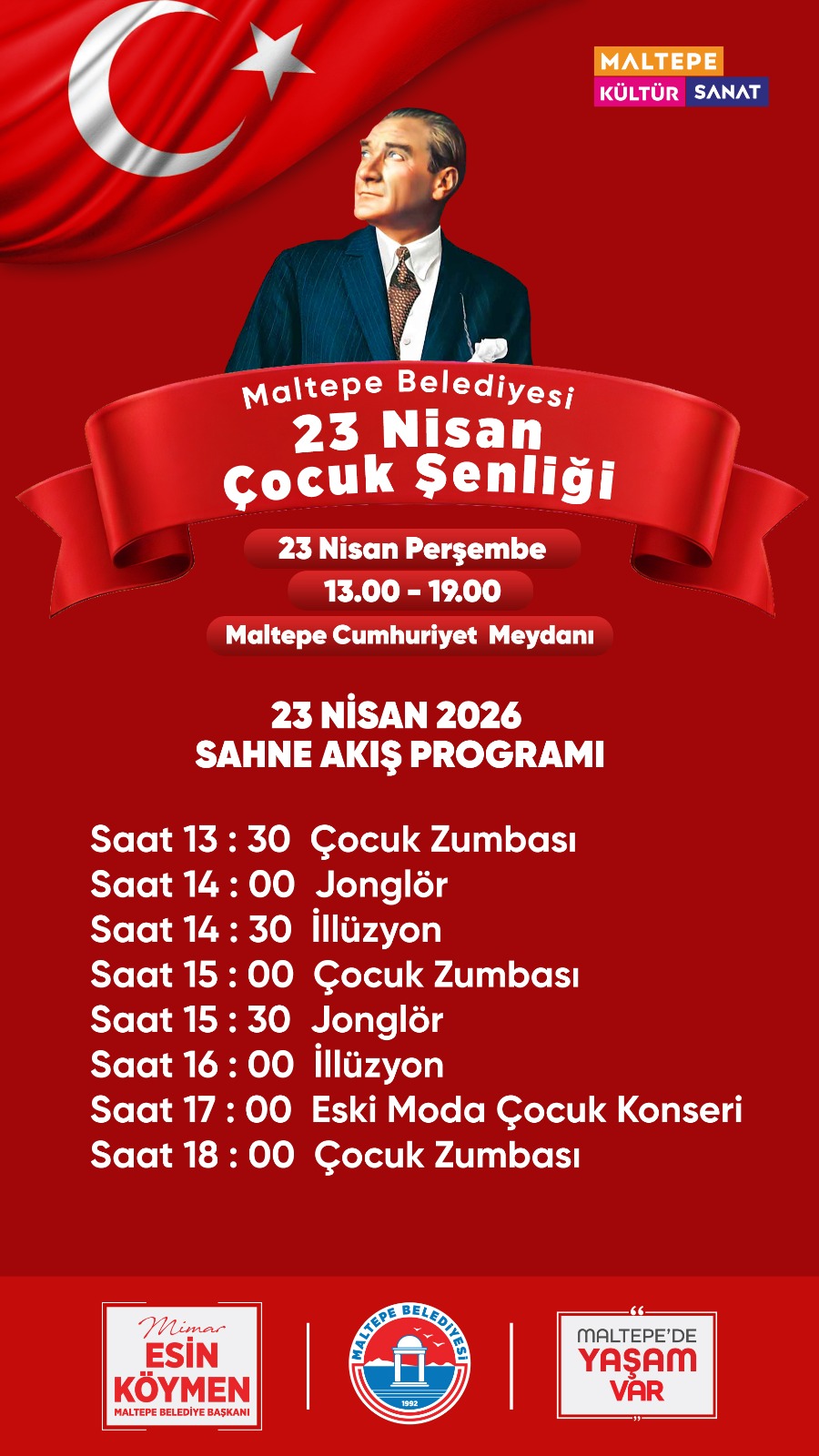 Maltepe Belediyesi, Türkiye Büyük Millet Meclisi’nin açıldığı, Türkiye Cumhuriyeti’nin kurucusu Ulu Önder Gazi Mustafa Kemal Atatürk’ün çocuklara armağan ettiği 23 Nisan Ulusal Egemenlik ve Çocuk Bayramı’nın 106. yıl dönümünü Maltepe Cumhuriyet Meydanı’nda düzenleyeceği şenlikle kutlayacak. Maltepeli çocuklar, gün boyu devam edecek etkinlik ve gösterilerle 23 Nisan Çocuk Şenliği’nde bayram coşkusunu yaşayacak.