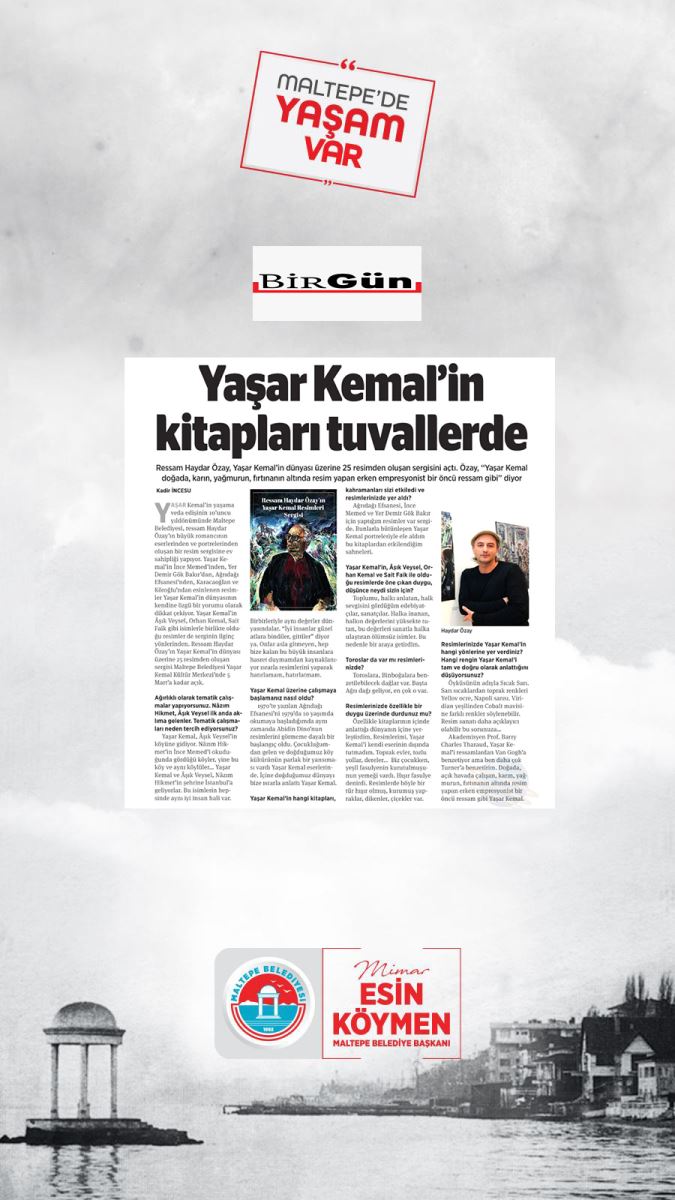 Ressam Haydar Özay, Yaşar Kemal'in dünyası üzerine 25 resimden oluşan sergisini açtı. Özay, "Yaşar Kemal doğada, karın, yağmurun, fırtınanın altında resim yapan erken empresyonist bir öncü ressam gibi" diyor Kadir İNCESU Yaşar Kemal'in yaşama veda edişinin ıo'uncu yıldönümünde Maltepe Belediyesi, ressam Haydar Özay'ın büyük romancının eserlerinden ve portrelerinden oluşan bir resim sergisine ev sahipliği yapıyor. Yaşar Kemal'in İnce Memed'inden, Yer Demir Gök Bakır'dan, Ağrıdağı Efsanesi'nden, Karacaoğlan ve Köroğlu'ndan esinlenen resimler Yaşar Kemal'in dünyasının kendine özgü bir yorumu olarak dikkat çekiyor. Yaşar Kemal'in Âşık Veysel, Orhan Kemal, Sait Faik gibi isimlerle birlikte olduğu resimler de serginin ilginç yönlerinden. Ressam Haydar Özay'ın Yaşar Kemal'in dünyası üzerine 25 resimden oluşan sergisi Maltepe Belediyesi Yaşar Kemal Kültür Merkezi'nde 5 Mart'a kadar açık. Ağırlıklı olarak tematik çalışmalar yapıyorsunuz. Nâzım Hikmet, Âşık Veysel ilk anda aklıma gelenler. Tematik çalışmaları neden tercih ediyorsunuz? Yaşar Kemal, Âşık Veysel'in köyüne gidiyor. Nâzım Hikmet'in İnce Memed'i okuduğunda gördüğü köyler, yine bu köy ve aynı köylüler... Yaşar Kemal ve Âşık Veysel, Nâzım Hilcmet'in şehrine İstanbul'a geliyorlar. Bu isimlerin hepsinde aynı iyi insan hali var. Birbirleriyle aynı değerler dünyasındalar. "İyi insanlar güzel atlara bindiler, gittiler" diyor ya. Onlar asla gitmeyen, hep bize kalan bu büyük insanlara hasret duymamdan kaynaklanıyor ısrarla resimlerini yaparak hatırlamam, hatırlatmam. Yaşar Kemal üzerine çalışmaya başlamanız nasıl oldu? 1970'te yazılan Ağrıdağı Efsanesi'ni 1979'da 10 yaşımda okumaya başladığımda aynı zamanda Abidin Dino'nun resimlerini görmeme dayalı bir başlangıç oldu. Çocukluğumdan gelen ve doğduğumuz köy kültürünün parlak bir yansıması vardı Yaşar Kemal eserlerinde. İçine doğduğumuz dünyayı bize ısrarla anlattı Yaşar Kemal. Yaşar Kemal'in hangi kitapları, kahramanları sizi etkiledi ve resimlerinizde yer aldı? Ağrıdağı Efsanesi, İnce Memed ve Yer Demir Gök Bakır için yaptığım resimler var sergide. Bunlarla bütünleşen Yaşar Kemal portreleriyle ele aldım bu kitaplardan etkilendiğim sahneleri. Yaşar Kemal'in, Âşık Veysel, Orhan Kemal ve Sait Faik ile olduğu resimlerde öne çıkan duygu, düşünce neydi sizin için? Toplumu, halkı anlatan, halk sevgisini gördüğüm edebiyatçılar, sanatçılar. Halka inanan, halkın değerlerini yüksekte tutan, bu değerleri sanatla halka ulaştıran ölümsüz isimler. Bu nedenle bir araya getirdim. Toroslar da var mı resimlerinizde? Toroslara, Binboğalara benzetilebilecek dağlar var. Başta Ağrı dağı geliyor, en çok o var. Resimlerinizde özellikle bir duygu üzerinde durdunuz mu? Özellikle kitaplarının içinde anlattığı dünyanın içine yerleştirdim. Resimlerimi. Yaşar Kemal'i kendi eserinin dışında tutmadım. Toprak evler, tozlu yollar, dereler... Biz çocukken, yeşil fasulyenin kurutulmuşunun yemeği vardı. Hışır fasulye denirdi. Resimlerde böyle bir tür hışır olmuş, kurumuş yapraklar, dikenler, çiçekler var. Haydar Özay Resimlerinizde Yaşar Kemal'in hangi yönlerine yer verdiniz? Hangi rengin Yaşar Kemal'i tam ve doğru olarak anlattığını düşüyorsunuz? Öyküsünün adıyla Sıcak Sarı. Sarı sıcaklardan toprak renkleri Yellov ocre, Napoli sarısı. Viridian yeşilinden Cobalt mavisine farklı renkler söylenebilir. Resim sanatı daha açıklayıcı olabilir bu sorunuza... Akademisyen Prof. Barry Charles Tharaud, Yaşar Kemal'i ressamlardan Van Gogh'a benzetiyor ama ben daha çok Turner'a benzetirim. Doğada, açık havada çalışan, karın, yağmurun, fırtınanın altında resim yapan erken empresyonist bir öncü ressam gibi Yaşar Kemal.